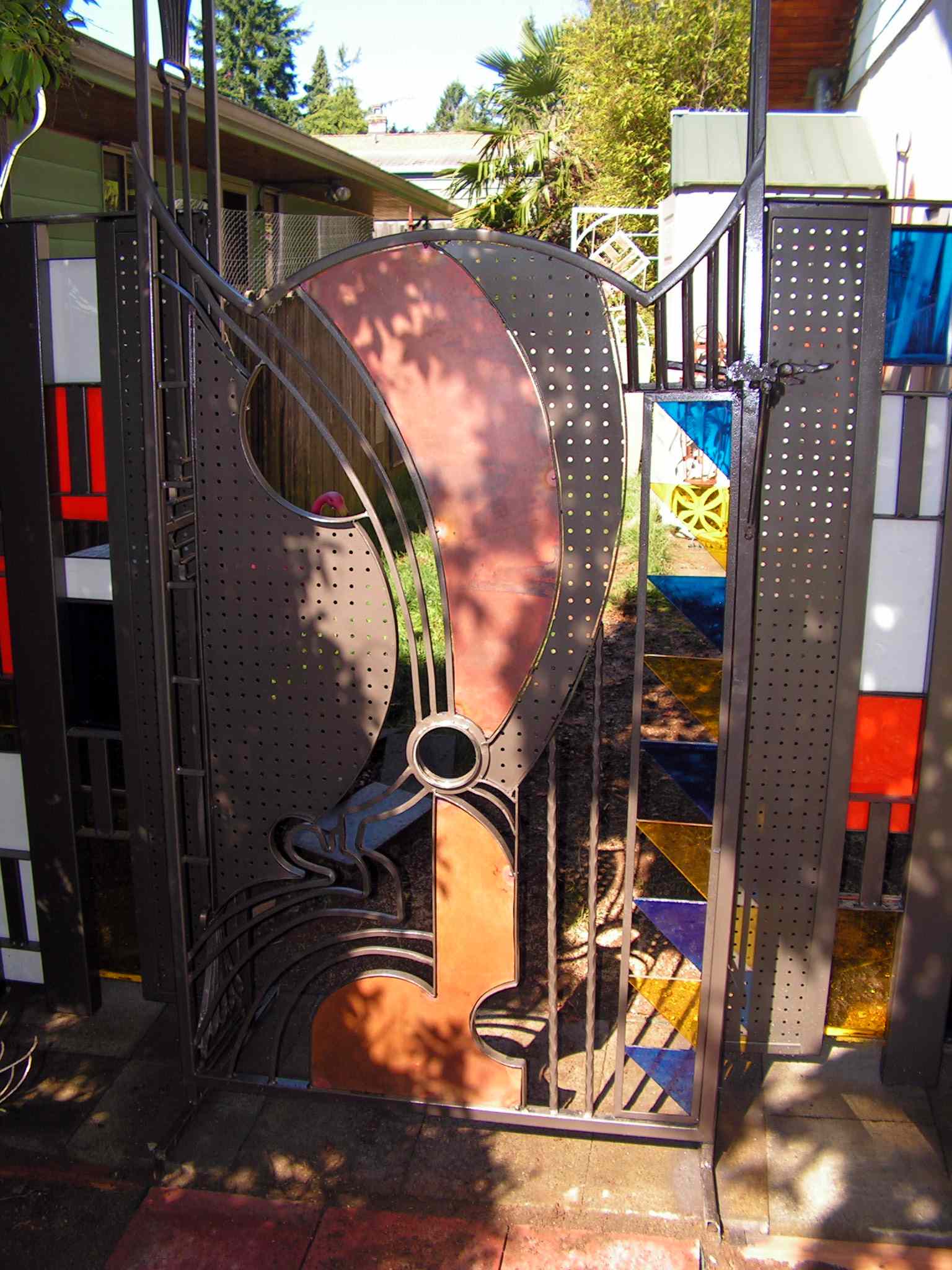 Art Nouveau Gate partially constructed of recycled retail fixtures, copper,